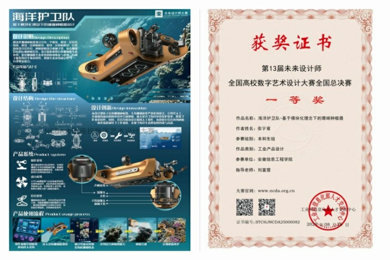 其中张宇童同学的装备产品与出行工具作品《海洋护卫队-基于模块化理念下的珊瑚种植器》在激烈的角逐中斩获国赛一等奖。黄健宇、郑婧同学的信息可视化设计《中国古代自然科学发展信息可视化》荣获国赛二等奖。