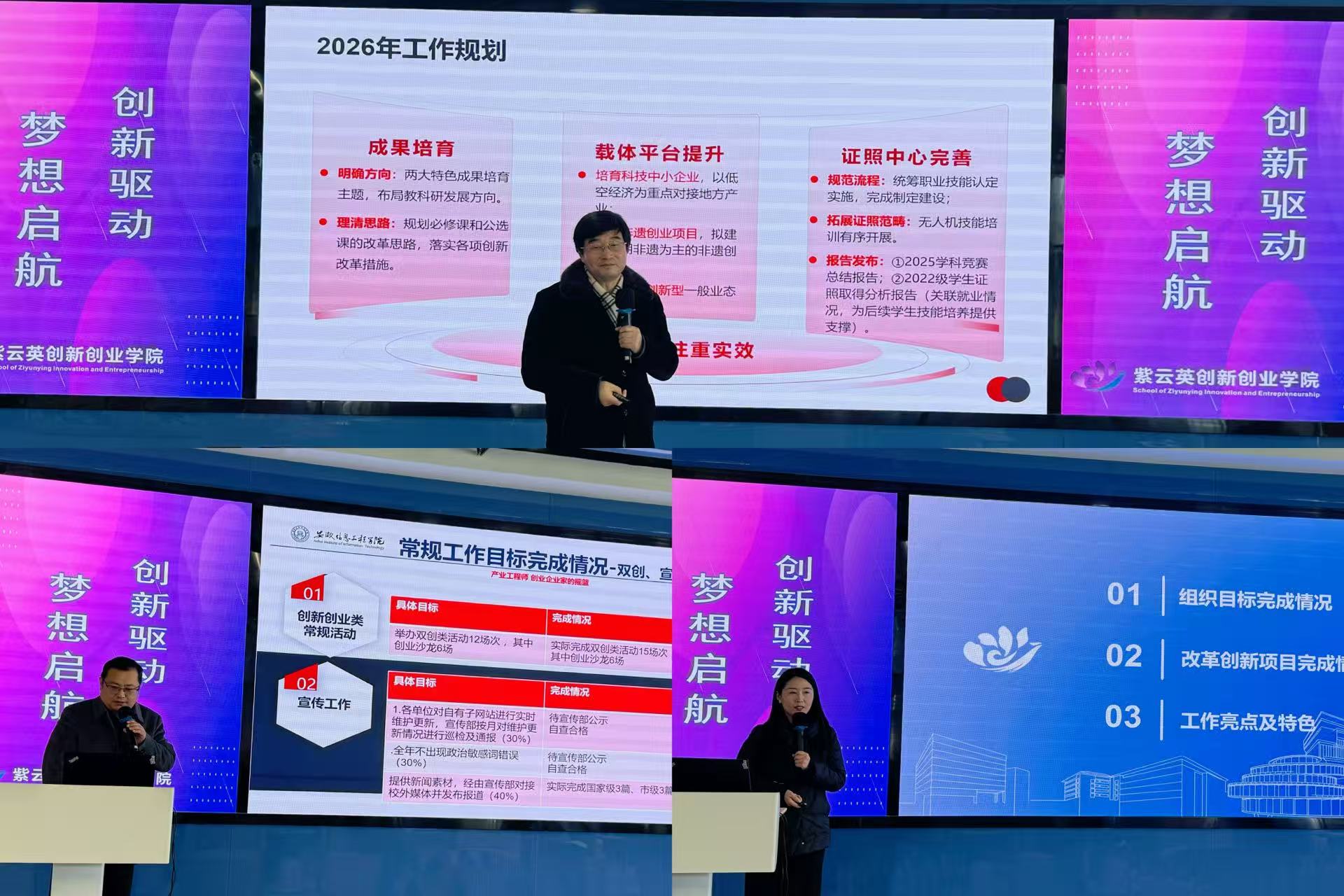在学院中层干部内部述职评议环节,学院领导班子围绕2025年度创新措施与典型做法、优秀成果内涵展示、增量工作及2026年工作规划四大方面进行全面汇报。汇报中,各领导结合分管工作,既晒出年度“成绩单”:详述制度建设、学科竞赛组织、创业项目孵化等方面的创新举措与典型经验,以具体数据展现教科研成果突破、双创服务效能优化等亮眼成果;也梳理了增量工作重点突破,包括省级教学成果奖申报、国家级平台培育、证照中心筹建等专项工作的进展与成效;同时,不避短板、厘定改进方向,并围绕成果培育深化、载体平台升级、人才队伍建设等核心方向,规划了2026年的工作路径。