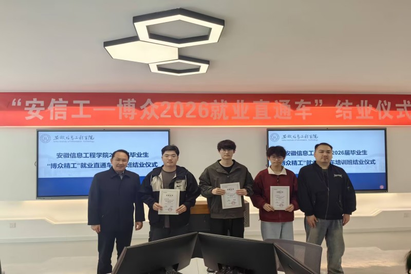 本网讯 4月7日上午,安徽信息工程学院与苏州博众精工科技有限公司联合举办的2026届“博众精工就业直通车”培训班结业仪式,在学校求新楼数字孪生实验室举行。经过为期一个月的高强度、定制化培训与严格考核,项目取得丰硕成果,共有38名学员通过最终面试筛选,成功获得企业录用,实现了从校园到职场的精准对接与高质量就业。