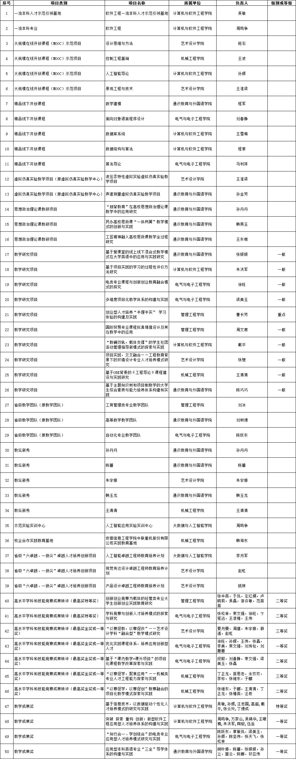 各单位:2019年11月8日,学校教学指导委员会对2019年度省级质量工程申报项目进行了答辩评审,现将评审结果予以公示: 公示时间为2019年11月9日-2019年11月12日。如有异议,请按下述联系方式进行反馈。监察审计处:0553-8795152 axgjsc@iflytek.com教务处:0553-8795016 yangzhang5@iflytek.com安徽信息工程学院教务处2019年11月9日