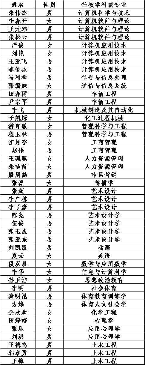 根据省教育厅《关于做好安徽省2019年高等学校教师资格认定工作的通知》(教资﹝2019﹞15号)文件要求,经个人网上报名申请、体检、现场确认、教育教学基本素质和能力测试等工作,现对我校2019年高校教师资格认定初审通过人员名单予以公示,具体如下:姓名性别任教学科或专业朱伟杰男计算机科学与技术李春开女计算机软件与理论王元玮男计算机软件与理论张松云男计算机软件与理论严俊女计算机应用技术刘艳女计算机应用技术王亚飞男计算机应用技术李俊杰男计算机应用技术马利祥男信号与信息处理张编妹女通信与信息系统田春雨男车辆工程尹宗军男车辆工程李飞男机械制造及其自动化于凯烁女化工过程机械游许敏女管理科学与工程程玉林男管理科学与工程江月亭女工商管理赵伟男工商管理王珮珮女人力资源管理朱苗苗女人力资源管理殷周喆男市场营销张磊女传播学张超男艺术设计李广栋男艺术设计李子豪男艺术设计陈亮男艺术设计学伍俊男艺术设计学张玉成男艺术设计学张亚东男艺术设计学刘凯凯男动画夏云女英语段双双女数学与应用数学李华女信息与计算科学孙玉洁女思想