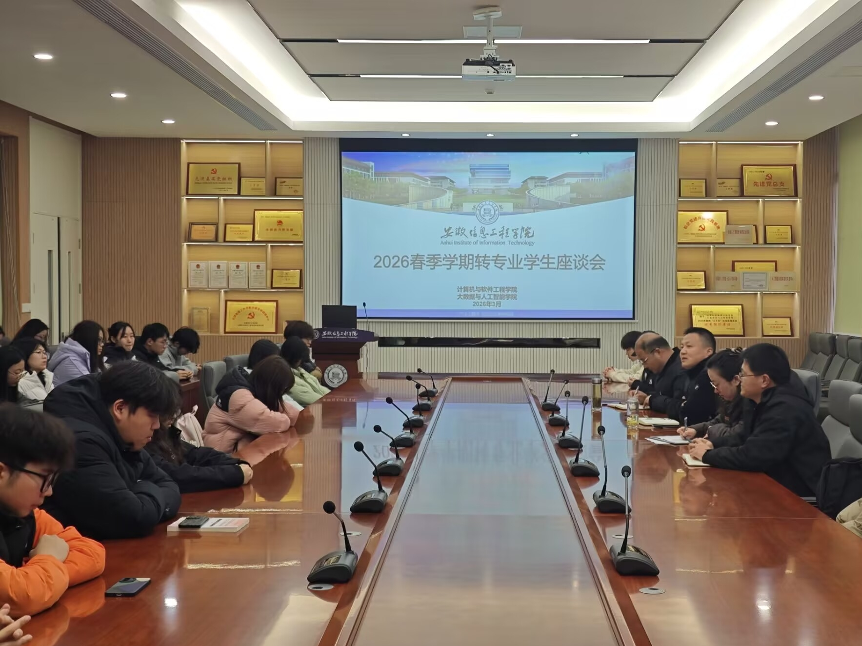 本网讯 为切实做好转专业学生教育管理与服务保障工作,破解学生转入后在学业衔接、环境适应、发展规划等方面的困惑,帮助新转入同学快速融入学院大家庭、明晰学习方向,3月16日,计算机(大数据)学院于博思楼A6S205召开了2026春季学期转专业学生座谈会。学院党总支副书记潘经健、教学主管段微微、学工主管冷自永、教务员张培龙以及大一全体辅导员共同出席会议,与全体转专业学生面对面交流。(图为会议现场)座谈会上,氛围热烈而融洽。转专业学生结合自身实际,主动畅谈转入新专业后的感受与困惑,围绕课程补修安排、宿舍调整、专业学习方法、未来发展规划等核心问题积极提问,表达了对尽快适应新专业、提升专业能力的迫切需求。针对同学们提出的各类问题,与会老师逐一耐心回应、细致解答。张培龙详细说明补修课程的选课流程、学分认定标准及时间节点,明确了学业衔接的具体要求;冷自永就宿舍调整、学生日常管理规范等事宜作出说明,强调学院将全力保障同学们的学习生活需求;段微微结合专业培养方案,为同学们梳理了专业课程体系、核心能力要求,鼓