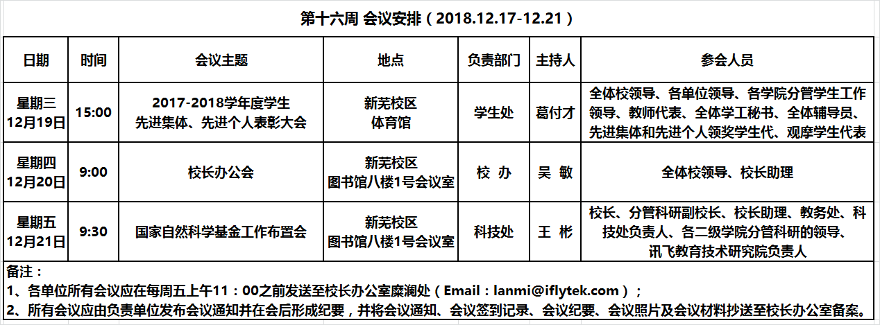 各学生会:经校党委和省学联同意,决定召开安徽信息工程学院第二次学生代表大会,现就有关事项通知如下:一、会议时间、地点会议自12月19日下午16:30至下午18:30,其中:(一)预备会议: 12月19日16:30,图书馆报告厅(二)大会开幕式: 12月19日17:0O,图书馆报告厅(三)第一次全体会议:12月19日17:20, 图书馆报告厅(四)第二次全体会议:12月19日17:50, 图书馆报告厅(五)大会闭幕式:12月19日18:00, 图书馆报告厅二、参会人员领导、嘉宾;学代会代表、列席代表。三、有关要求(一)参会人员要切实增强政治纪律与组织观念,以良好的精神风貌和纪律作风认真参加会议,坚决禁止非组织活动和不正之风。(二)参会代表由所在学院学生会负责通知。请各学院学生会通知并组织好与会代表按时参加会议。列席代表由所在学院学生会负责通知,参加所在学院代表团会议。(三)参会代表统一着正装,佩戴代表证、列席代表证进入会场。(四)参会代表参会时应按规定时间提前进入会场,按指定区域就坐,自觉