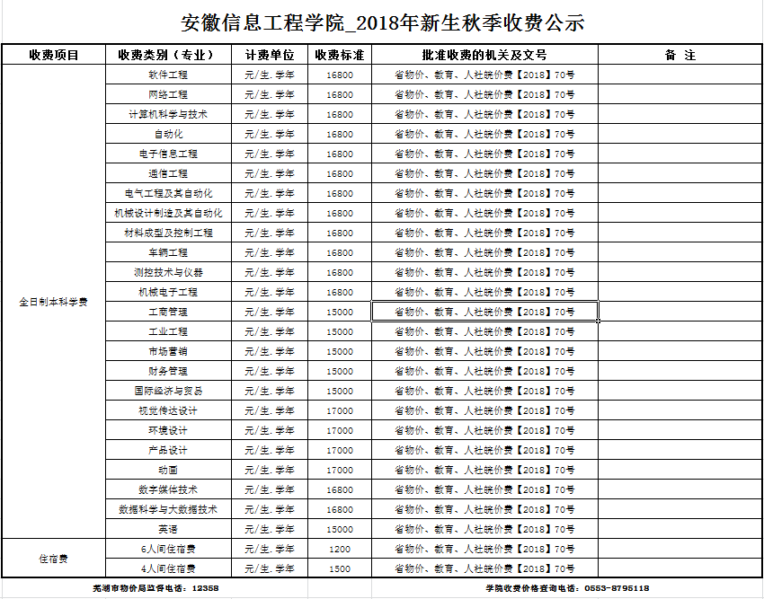 备注: 1、学费、住宿费收费标准按照《安徽省物价局 安徽省教育厅 安徽省人力资源用社会保障厅 关于开展放开民办教育收费试点工作有关事项的通知》皖价费【2018】70号的文件精神制定,并已报省物价局和省教育厅备案。 2、学费、住宿费收费标准为:老生老标准、新生新标准。2018.xlsx