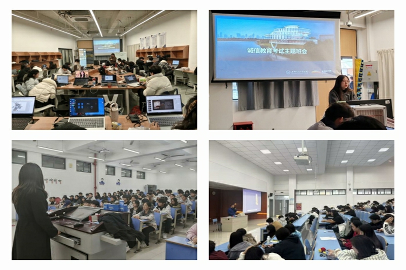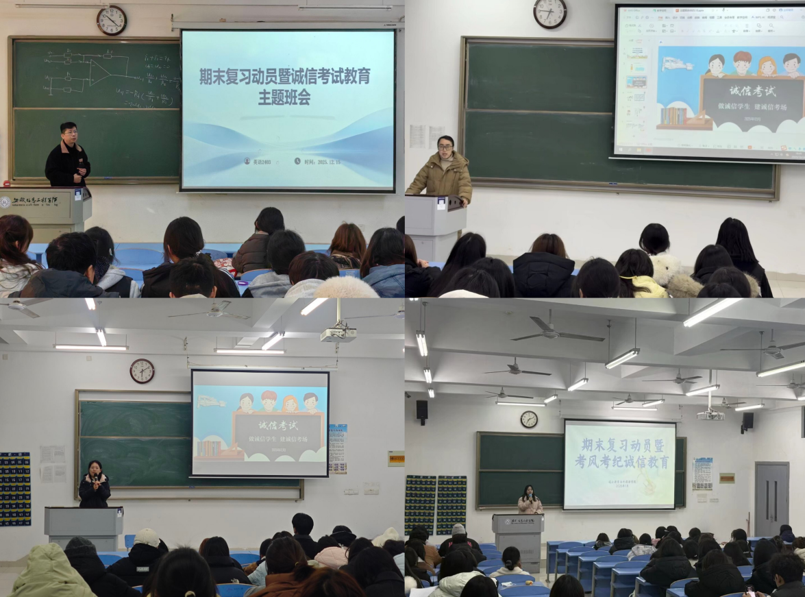 本网讯 期末考试临近,为进一步加强学风建设,严肃考风考纪,引导学生树立诚信应考意识,通识教育与外国语学院于近期组织各年级召开“期末复习动员暨诚信考试教育”主题班会,营造公平、公正、有序的应考氛围。班会上,各年级辅导员结合《安徽信息工程学院学生违纪处分办法》等相关规章制度,针对不同阶段学生的特点,采用多元化教育形式,通过制度解读、案例分析、互动讨论等方式,全方位强化学生的诚信意识。(图为各年级辅导员主题宣贯)辅导员通过剖析真实的考试违纪案例,让学生直观认识到作弊行为的严重后果。在深入学习规章制度、充分了解作弊危害后,各班学生在辅导员的组织下郑重签署《诚信考试承诺书》。除考风考纪教育外,各年级辅导员还围绕复习方法与考前心态开展针对性指导,鼓励同学们科学备考、沉着应考。各班级充分发挥学生党员、骨干的朋辈引领作用,组建学业帮扶小组,为学习困难学生提供精准辅导。通识教育与外国语学院将持续加强考风考纪教育,坚持教育引导与严格管理相结合,不断增强学生的诚信意识和规矩意识,将诚信教育融入学生培养全过程,