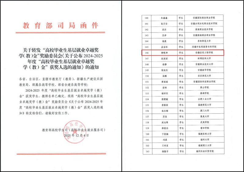 本网讯 近日,教育部2024-2025年度“高校毕业生基层就业卓越奖学(教)金”获奖名单公布,计算机(大数据)学院2018届软件工程专业优秀毕业生柳乾坤入选,实现了我校在此项评选中的历史性突破。此次获奖,是学校成功推动毕业生高质量就业的又一缩影。(图为表彰文件)“高校毕业生基层就业卓越奖学金”是由教育部高校学生司和学生服务与素质发展中心共同指导,中国长江三峡集团出资,中国教育发展基金会设立的为引导和鼓励高校毕业生到基层建功立业的国家级重要奖项。该奖项评选严格,旨在表彰在基层岗位表现卓越、贡献突出的优秀毕业生,具有很高的权威性。2025年,全国共有418名优秀高校毕业生获此殊荣,其中安徽省有17位入选(芜湖市有2位)。此次获奖,是对柳乾坤扎根基层、爱岗奉献的重要表彰,也是对学校长期坚持的基层就业导向和精心构建的校友工作机制的充分肯定。闪耀在平凡岗位的基层警星柳乾坤,安徽临泉人,安徽信息工程学院计算机与软件工程学院2018届软件工程专业毕业生,现任安徽省阜阳市临泉县公安局城关派出所民警,三级