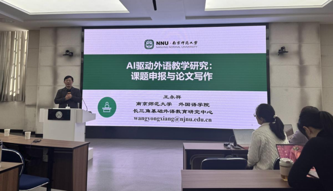 本网讯 11月28日下午,通识教育与外国语学院特邀南京师范大学外国语学院博士生导师王永祥教授,在博学楼W301教室作《AI驱动外语教学研究:课题申报与论文写作》专题学术讲座。学院全体英语教师及英语专业学生代表参加讲座。讲座围绕人工智能与教育深度融合的背景下,外语教学所面临的挑战及应对策略展开深入讨论。(图为王永祥教授作讲座)讲座开篇,王永祥立足人工智能与教育融合的时代背景,剖析了外语教学领域的变革趋势。他指出,AI技术正推动外语教学从“标准化”向“个性化”转型,如今,学生的学习路径可以根据个人需求进行定制,学习进度和效果也能通过实时反馈精确调整。王永祥强调,AI技术的引入使教学活动不再单纯依赖教师和学生之间的互动,而是多方协作的结果。在这一新的教学模式中,教师不再是课堂的唯一中心人物,而是作为“多主体中的首席”发挥作用。在讲解教师角色的转型时,王永祥特别强调,人工智能的介入正推动教师角色的深刻变化。教师不再仅仅是知识的传递者,而是学生成长的“赋能者”。在这种背景下,学生的角色也发生了变化