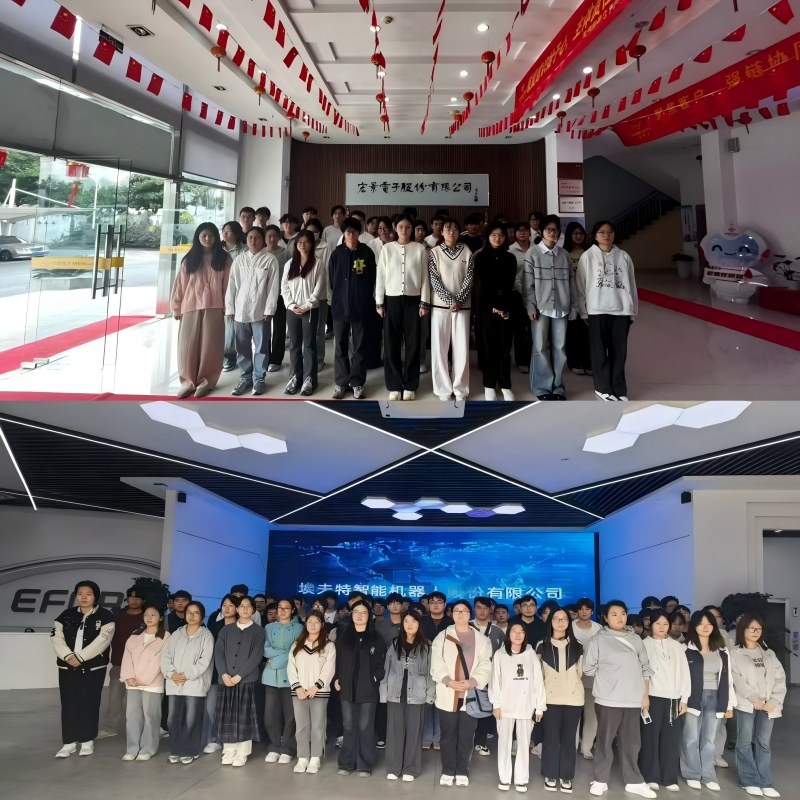 本网讯 为深化产教融合、强化实践教学环节、拓宽学生行业视野,10月29日,芜湖智能制造产业学院组织工业自动化、汽车电子两个专业方向学生开展企业参观交流活动。本次活动通过实地走访行业领先企业,助力学生直观掌握前沿技术应用与产业发展动态,推动理论知识与实践应用深度融合。活动当天,工业自动化方向学生在学院教师带队下,赴埃夫特智能机器人股份有限公司开展参观学习。在企业技术人员的引导下,同学们先后走访机器人本体制造车间、系统集成测试区及技术展示中心,全面了解工业机器人研发、生产、装配、测试全流程。企业技术人员为同学们讲解了机器人在焊接、喷涂、搬运等多个工业场景下的实际应用案例,并就自动化生产线集成解决方案的发展趋势与同学们进行了深入交流。同学们纷纷表示,此次参观使其对工业机器人的核心技术、市场定位及未来发展方向有了更为具体和深刻的认识,受益匪浅。与此同时,汽车电子方向学生前往宏景电子有限公司交流学习。在企业技术负责人的陪同下,同学们参观了高度自动化生产车间、严谨的产品检测实验室以及先进的研发中心。