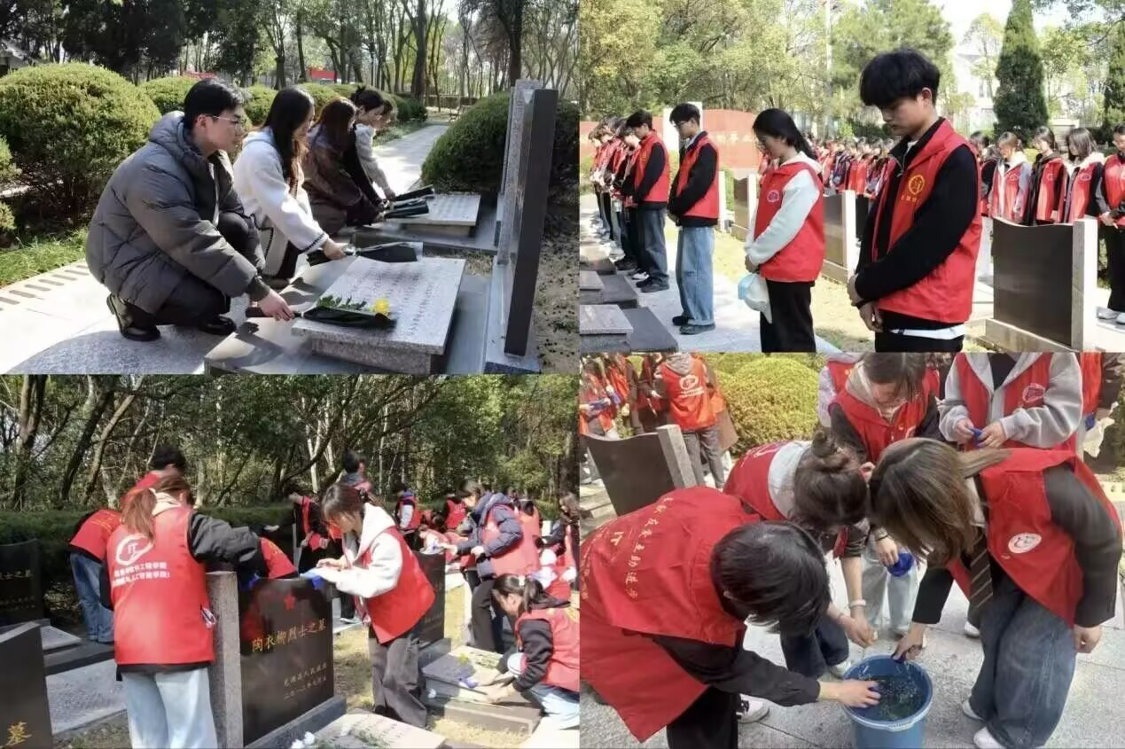 本网讯 青山巍巍,松柏常青。为深切缅怀革命先烈的丰功伟绩,传承红色基因,弘扬爱国主义精神,在清明节来临之际,4月3日,通识教育与外国语学院学生党支部联合湾沚民主社区社会组织联合会,赴湾沚区烈士陵园开展“缅怀革命先烈,传承红色基因”清明祭扫主题党日共建活动。烈士陵园内庄严肃穆,翠柏掩映。全体参与人员身着素装,胸佩党徽,怀着无比崇敬的心情,在革命烈士纪念碑前列队肃立。活动在庄严的国歌声中正式拉开序幕。在深情的《献花曲》旋律中,党员代表抬起花篮,缓步走向革命烈士纪念碑,郑重将花篮敬献于碑前。随后,全体人员手持鲜花,依次绕行纪念碑,向长眠于此的革命先烈敬献手中的鲜花,并行深深三鞠躬,寄托对先烈们的无限哀思和崇高敬意。一朵朵盛放的菊花,承载着对英烈的深切缅怀;一次次深深的鞠躬,凝聚着继承先烈遗志的坚定信念。祭拜仪式结束后,学生党员志愿者们自发开展了“擦拭墓碑,缅怀先烈”的志愿服务活动。他们俯身于一座座墓碑前,手持抹布,仔细擦拭着碑身上的浮尘,清理周围的落叶和杂草。每一块被擦拭干净的墓碑,在阳光下显