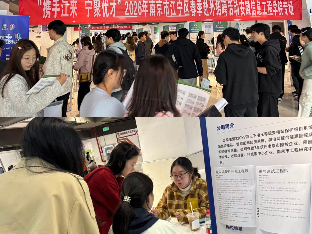 本网讯 为拓宽毕业生就业渠道,深化校地人才合作,4月1日,计算机与软件工程学院(大数据与人工智能学院)主动邀请南京市江宁区人力资源和社会保障局及辖区内优质企业进校,举办2026年南京市江宁区“携手江来 宁聚优才”春季赴外招聘活动安徽信息工程学院专场。本次活动在A32一站式学生社区一楼招聘大厅、博文楼E301分别举行专场招聘会与人才引进推介会,共邀请20余家优质企业入校揽才,吸引大批毕业生踊跃参与,现场气氛热烈,校地合作成效显著。当天下午,专场招聘会拉开帷幕。旺旺食品集团、南京天地人自动化有限公司、格力电工(南京)有限公司等20家龙头企业齐聚一堂,涵盖智能制造、食品加工、电气设备、新一代信息技术等多个重点领域,招聘会现场人头攒动,前来应聘的学生积极踊跃,与企业代表深入交流,展现出浓厚的求职热情。(图为招聘会现场学生与企业代表交流)随后,在人才引进及创业政策推介会上,江宁区人社局党组成员、副局长张晓龙,人才服务中心主任许敏、副主任艾玉成,南京市人社局就管中心创业指导科副科长乔莹,江宁区就业联