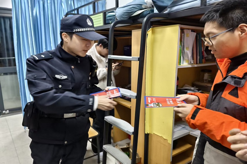 为进一步增强高校学生的防范电信网络诈骗意识,切实维护学生财产安全,学校保卫处联合东湖派出所组织警员深入校园,于11月9日-12月8日开展了为期一个月的“反电诈进宿舍”主题宣传活动。此次活动以“零距离、面对面”的宣传方式,将反诈知识送进学生宿舍,筑牢校园安全“防护网”。 活动期间,东湖派出所共出动警力120人次,由民警带队,组成宣传小分队,深入学生宿舍楼,逐层逐间走访,向学生发放反电诈宣传单页1000余份,并结合当前高发的电信诈骗典型案例,现场讲解刷单返利、虚假网络贷款、冒充客服退款、游戏账号交易诈骗等常见诈骗手段的识别与防范技巧。 此次“反电诈进宿舍”活动打破传统集中宣讲的模式,将宣传阵地前移至学生生活区,实现反诈宣传的“精准滴灌”。通过宿舍走访交流,不仅拉近与学生关系,更让反诈知识真正入脑入心,形成“人人知晓、人人防范”的良好氛围。